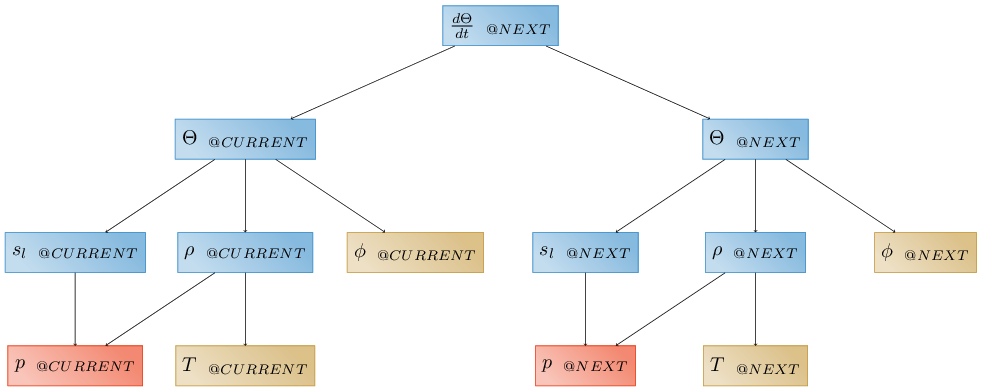 Here and throughout, primary variables are shown in red, independent variables in brown, secondary variables in blue, aliased variables in gray, and time-advanced variables in purple. Arrows in the graph point from an evaluator to its dependencies. Leaf nodes in the dependency graph are the primary variable \(p\) (pressure) and the independent variables \(T\) (temperature) and \(\phi\) (porosity), which must therefore be provided by the user as functions of space and time or as data. Secondary variable include \(s\) (saturation) computed as a function of pressure, \(\rho\) (density) computed as a function of temperature and pressure, and \(\Theta\) (water content), computed as a function of saturation, density, and porosity. Implied here (and in many of our figures) is the fact that these evaluators are all at the same tag.